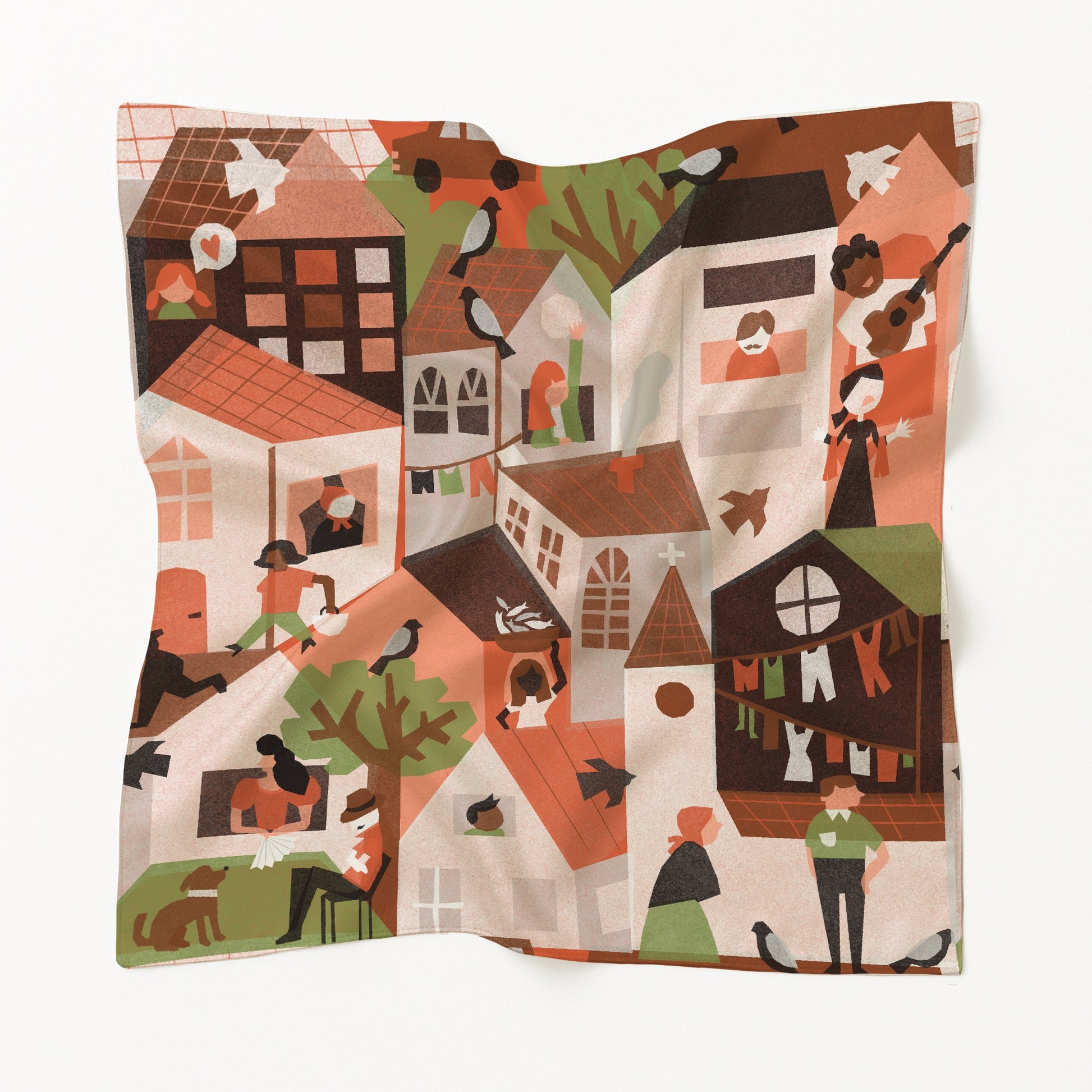 Entre ruas e casas, o dia começa com o chilrear das andorinhas e o bater apressado dos passos no passeio. O elétrico desliza cortando a cidade com sua nostalgia. A vendedora de peixe chama os fregueses com a voz firme de quem conhece o mar. Mulheres conversam à porta, ouve-se música no ar, o senhor dorme à beira da árvore, pombos esvoaçam entre praças e telhados; e varais coloridos dançam ao vento. O lenço dia à dia é um retrato da alma portuguesa: movimento, tradição e cor.