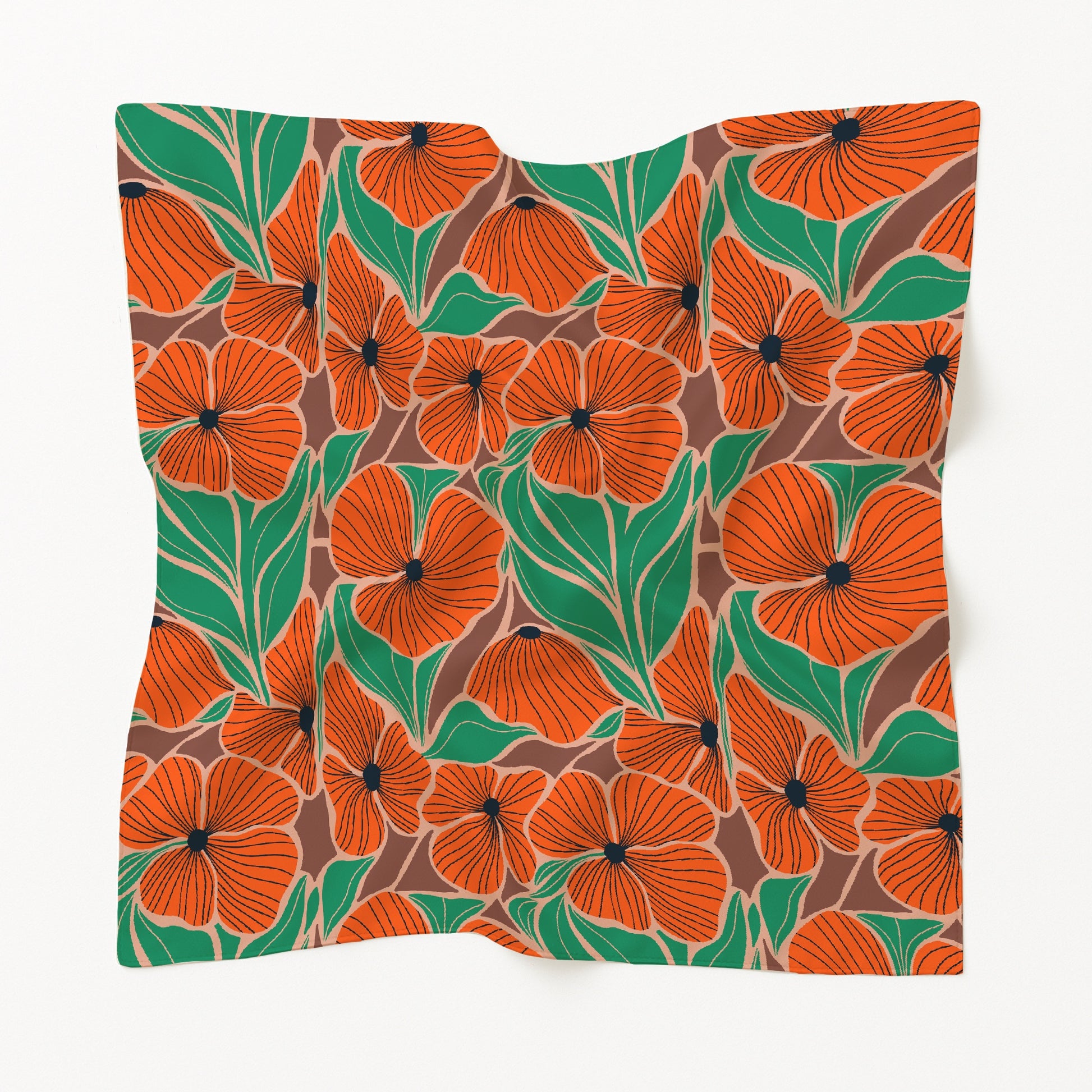 Entre traços que dançam leves sobre o tecido, flores laranjas desabrocham em harmonia com folhas verdes e um fundo castanho claro. É a natureza em poesia em movimento.